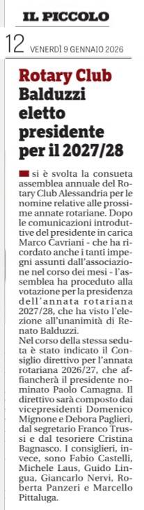 9 gennaio – Il Piccolo – Rotary Alessandria Renato Balduzzi presidente a.r. 2027-28