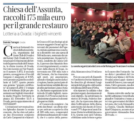 11 gennaio – Il Secolo XIX – Rotary Ovada del Centenario Chiesa dell’Assunta raccolti 175 mila euro