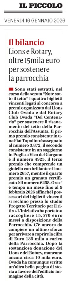 16 gennaio – Il Piccolo – Rotary Ovada del Centenario e Lions Bilancio per sostenere la parrocchia