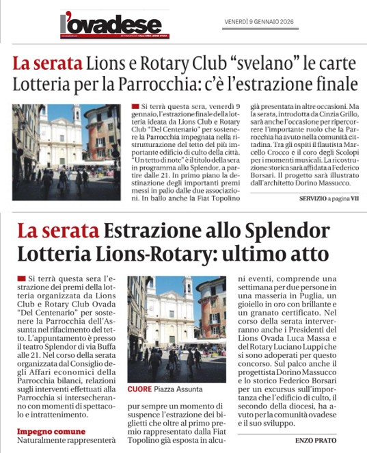9 gennaio – L’Ovadese – Rotary Ovada e Lions lotteria per la parrocchia estrazione finale