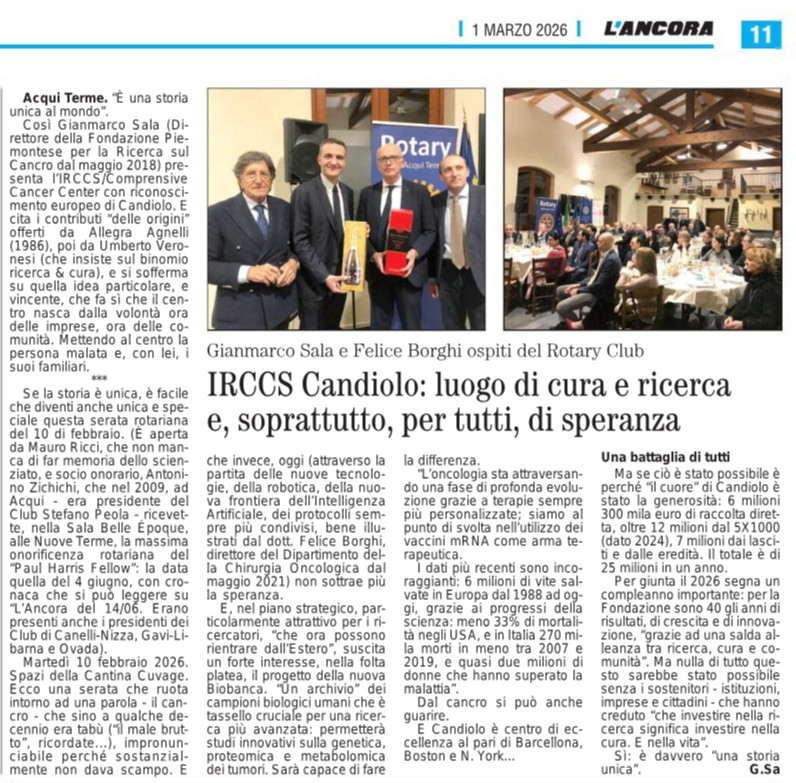 1 marzo – L’Ancora – Rotary Club Acqui Terme IRCCS Candiolo, luogo di cura e ricerca e, soprattutto, di speranza per tutti