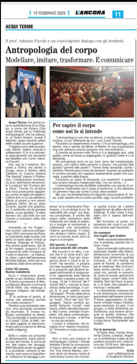 15 febbraio – L’Ancora – Rotary Acqui Terme Prof Adriano Favole con gli studenti Antrologia del corpo