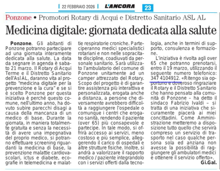 22 febbraio – L’Ancora – Rotary Club Acqui Terme Medicina digitale Giornata dedicata alla salute a Ponzone