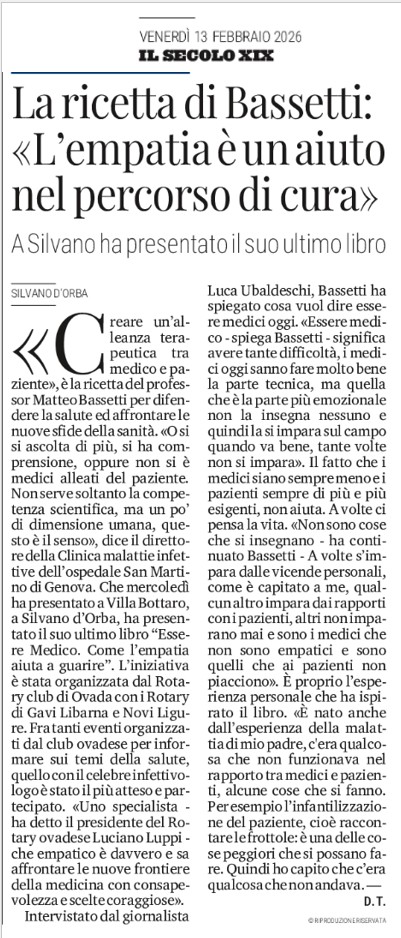 13 febbraio – Il Secolo XIX – Rotary Ovada del Centenario La ricetta di Bassetti “L’empatia è un aiuto nel percorso di cura”