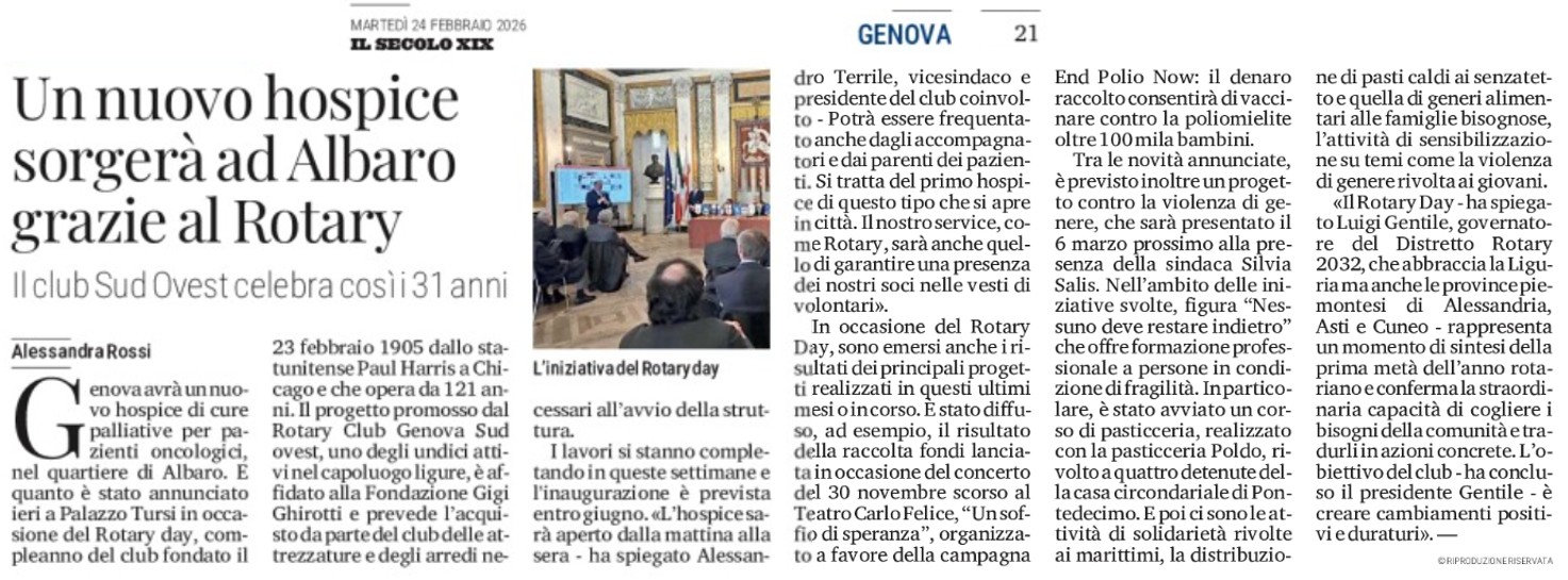 24 febbraio – Il Secolo XIX – Rotary Genovesi Un nuovo hospice sorgerà ad Albaro grazie al Rotary